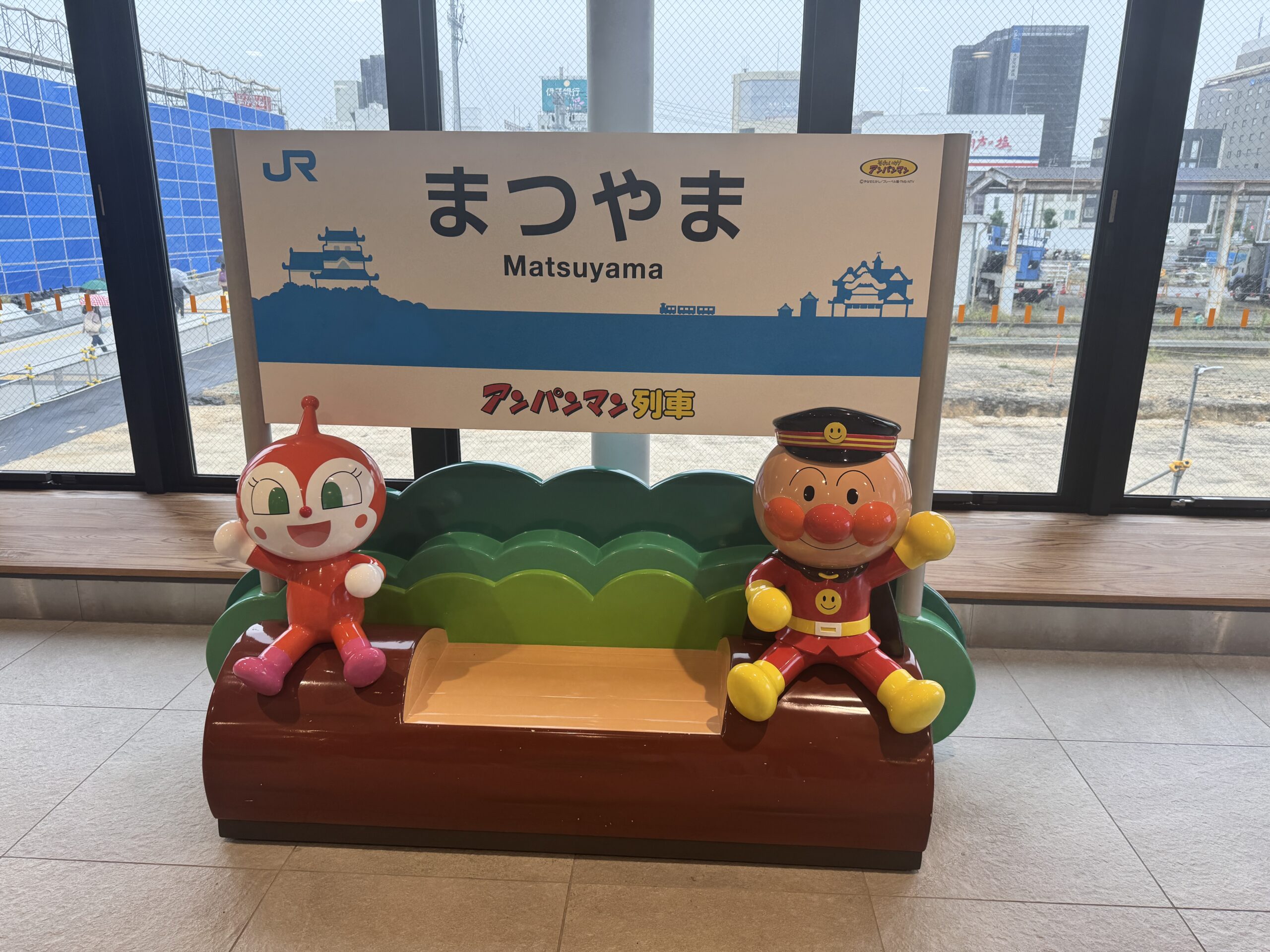 ・**松山駅(アンパンマン列車のベンチ)**で記念撮影