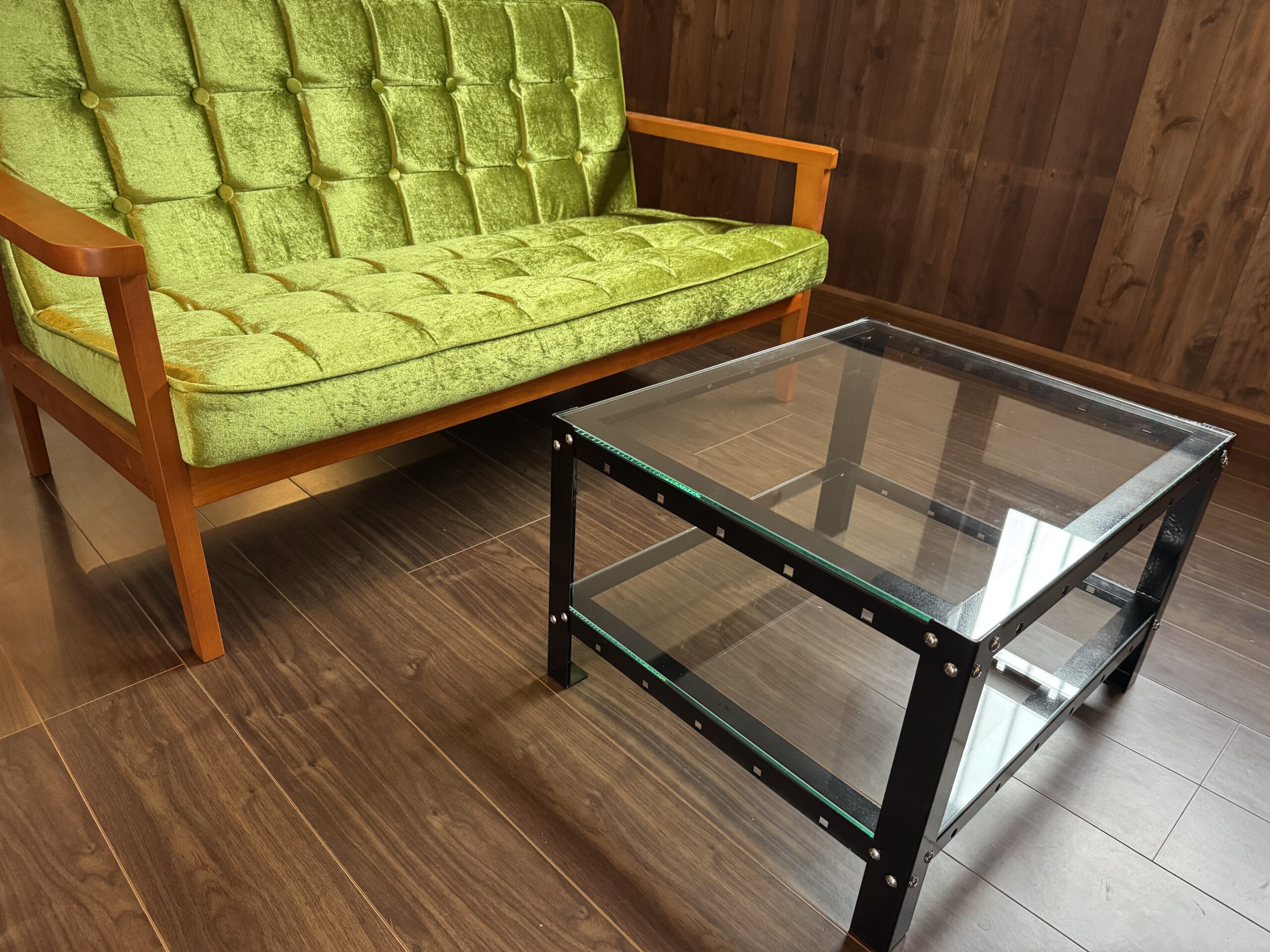 alt:緑のレトロソファと並んだ二段式アイアンガラステーブル