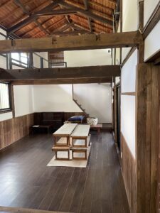 納屋リフォーム後の新しい屋根。ダークカラーの金属屋根で古民家風に